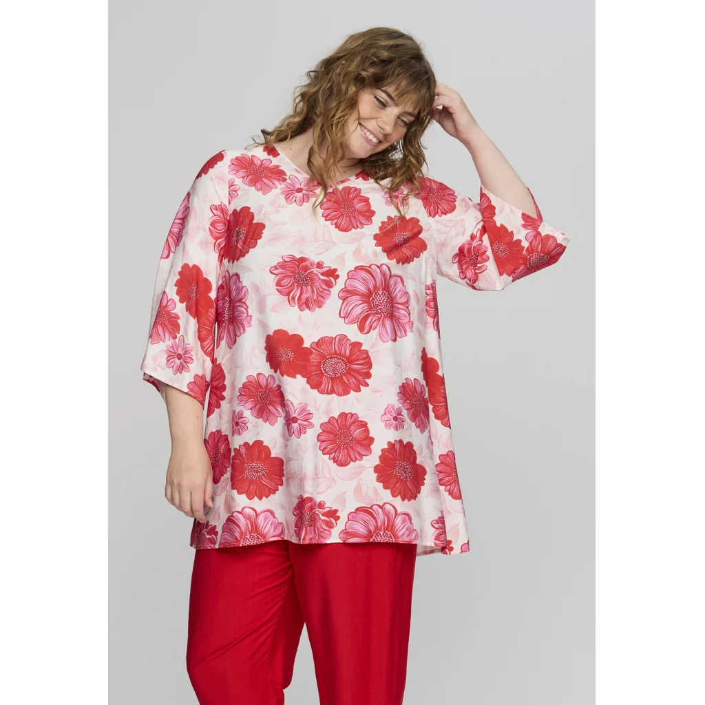 De røde blomster på den lyse bund giver et friskt og sommerligt look, der lyser ethvert outfit op.