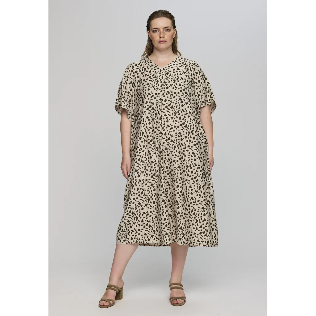 Det løse snit giver en flot og afslappet pasform, der falder smukt på kroppen uden at stramme. De korte ærmer og den fine V-hals gør kjolen både feminin og nem at style.