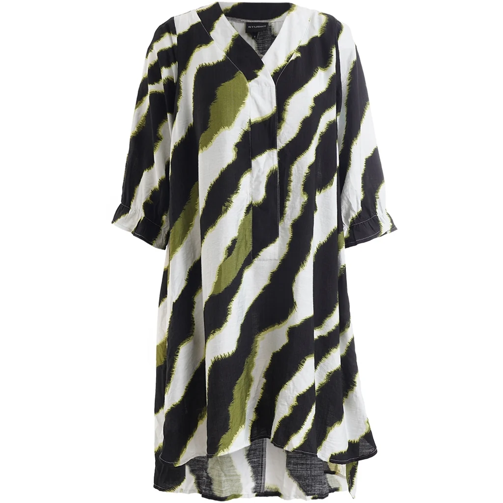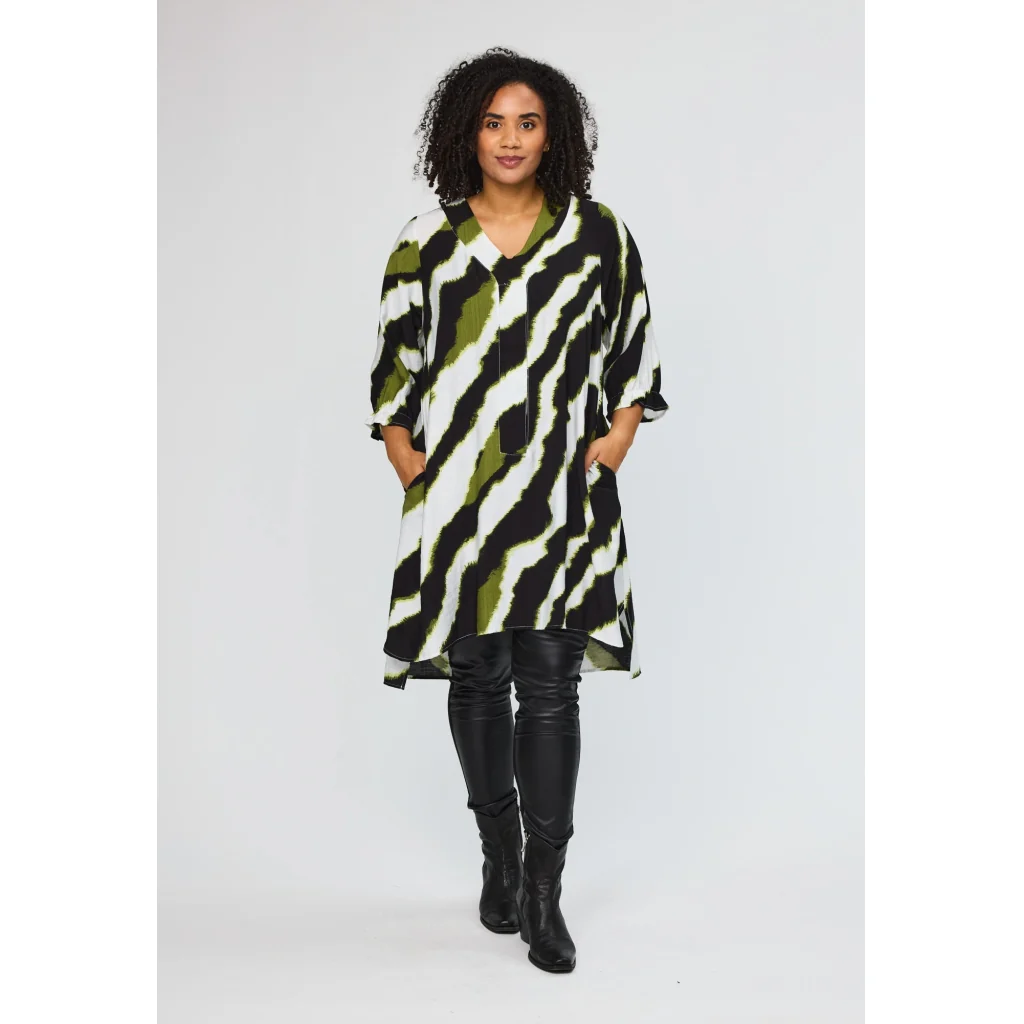 Kjolen er i tunikalængde og har 3/4-ærmer samt en feminin V-udskæring, der klæder mange kropstyper. Det grafiske print i flotte farver giver kjolen et moderne og stilfuldt udtryk, som nemt kan styles både op og ned.