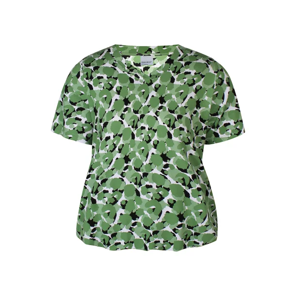 Det grønne print skaber et moderne og livligt udtryk, og den klassiske V-udskæring sammen med korte ærmer gør den let at kombinere med både jeans, shorts eller en nederdel. En ideel bluse til både hverdag og ferie – og så fås den i størrelser fra 42 til 56!