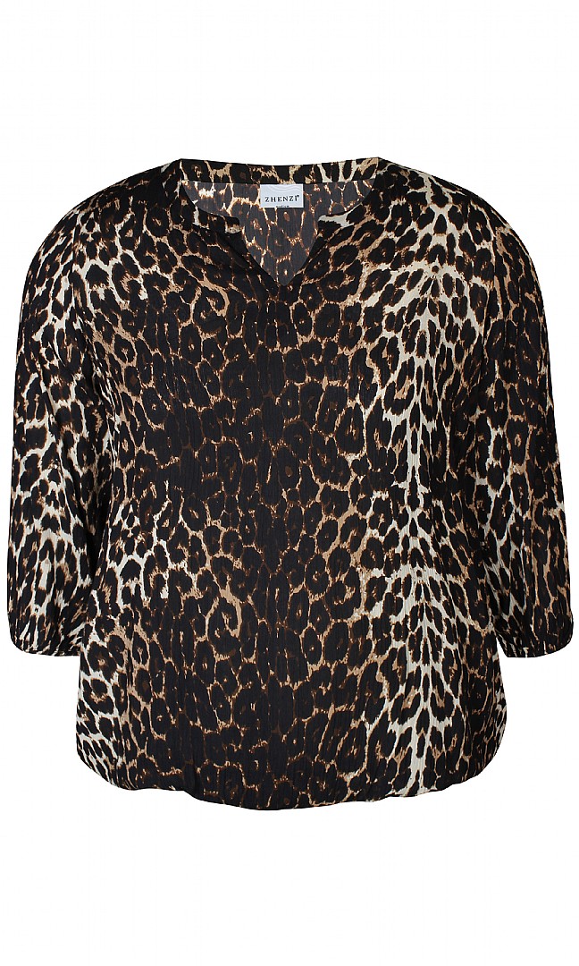 Denne flotte printet bluse fra Zhenzi med elastik i den nederste kant, hvilket gør at man nemt kan sætte blusen, så den poser lidt på maven. Blusen er i 100% Crepe Viskose, den er med 3/4 Ærmer med elastik kant. Leo print bliver så populær hertil efteråret.