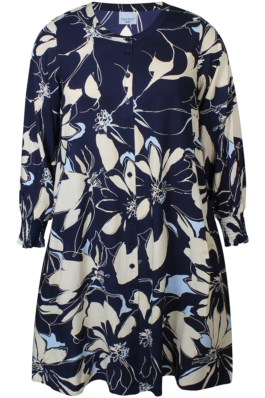 Smuk og feminin kjole fra Zhenzi, designet i en let og behagelig 100% viskose-kvalitet, der falder flot og giver masser af bevægelse. Kjolen har et elegant mønster, gennemgående knaplukning samt praktiske lommer i siderne.