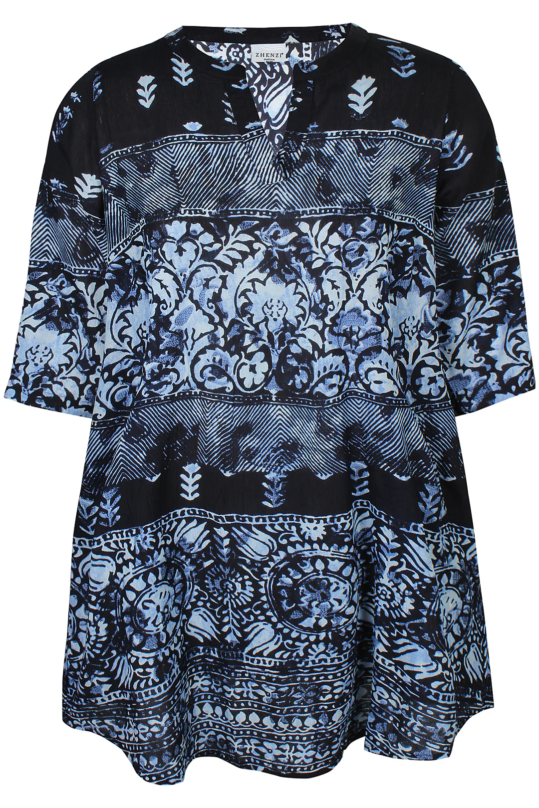 Denne skønne viskose kjole fra Zhenzi kombinerer komfort og stil med et flot grafisk print i blå og sorte nuancer. Kjolen har en løs og feminin pasform, korte ærmer og en let A-facon, der falder smukt på kroppen.