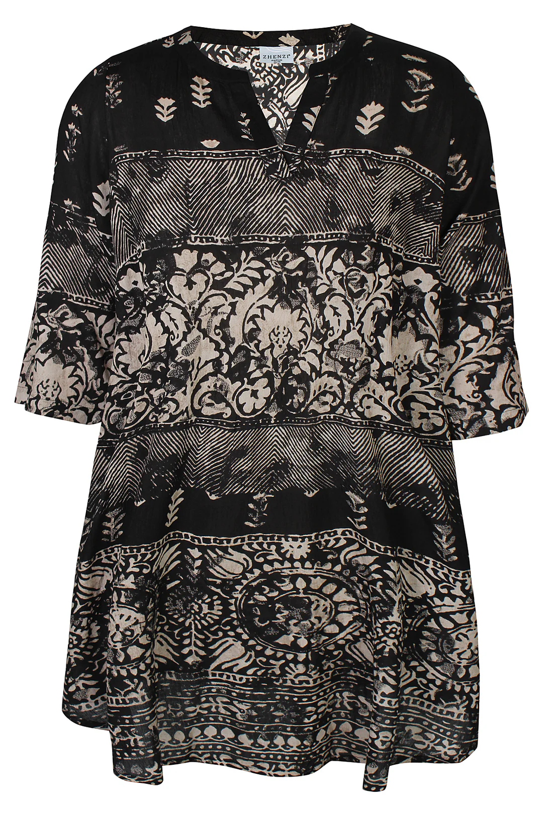 Denne smukke viskose kjole fra Zhenzi har et elegant print i sort og beige, der giver et roligt og stilfuldt udtryk. Kjolen har en løs pasform, ¾ ærmer og en feminin A-facon, som falder flot og giver god bevægelsesfrihed.