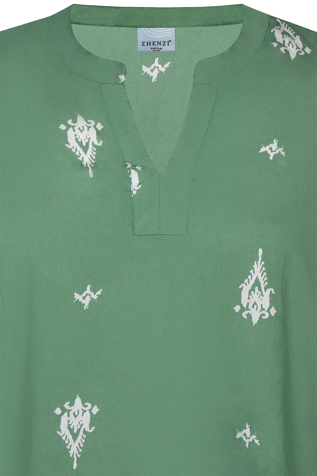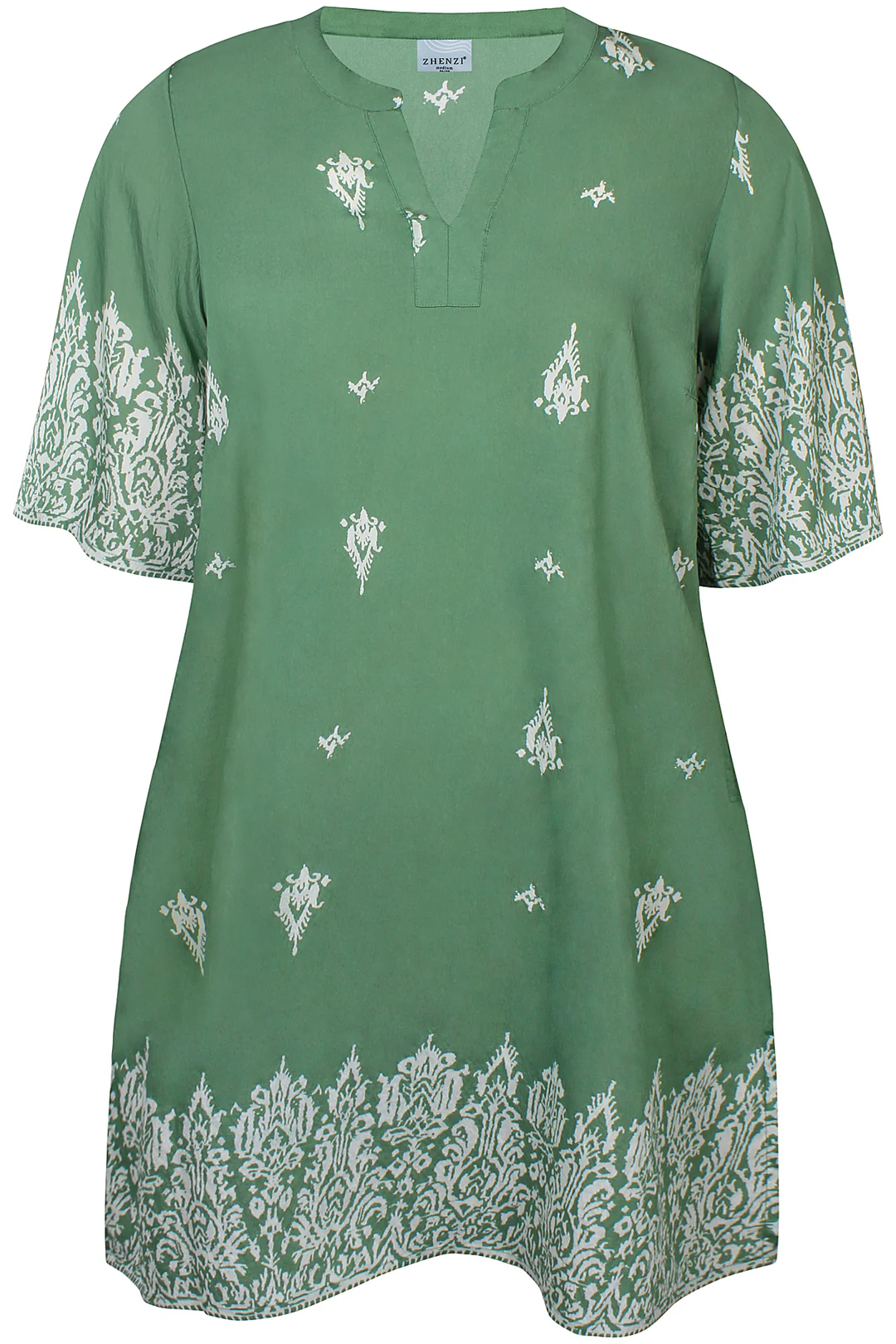 Smuk og feminin kjole fra Zhenzi i en flot grøn nuance med elegante hvide printdetaljer. Kjolen har et let og luftigt udtryk, der gør den perfekt til både hverdag og sommerens mange anledninger.