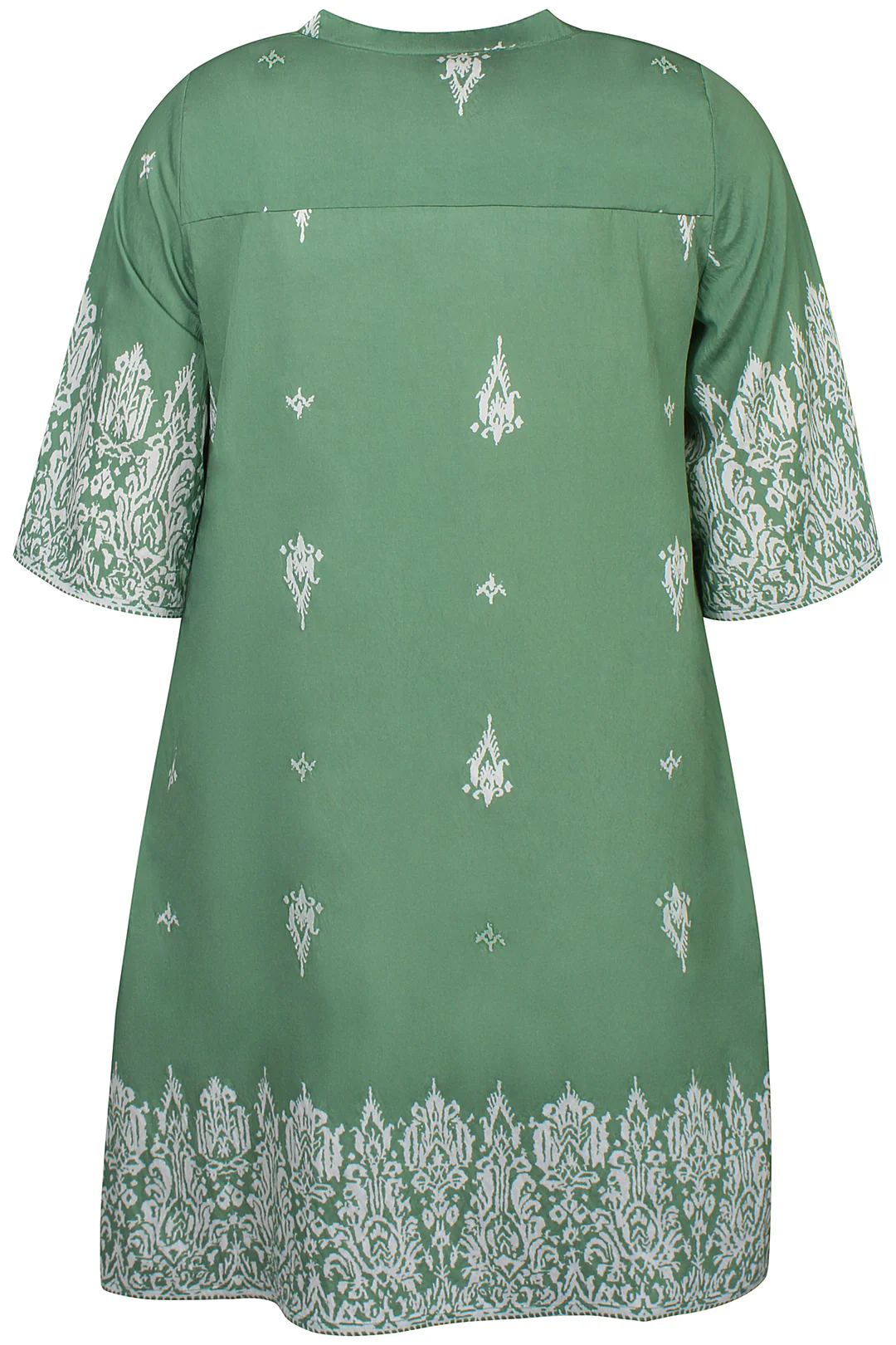 Designet er enkelt og flatterende med en løs pasform, korte ærmer og en fin V-udskæring, som giver et afslappet, men stilfuldt look. De dekorative mønstre ved ærmer og nederst på kjolen tilfører et eksklusivt touch.