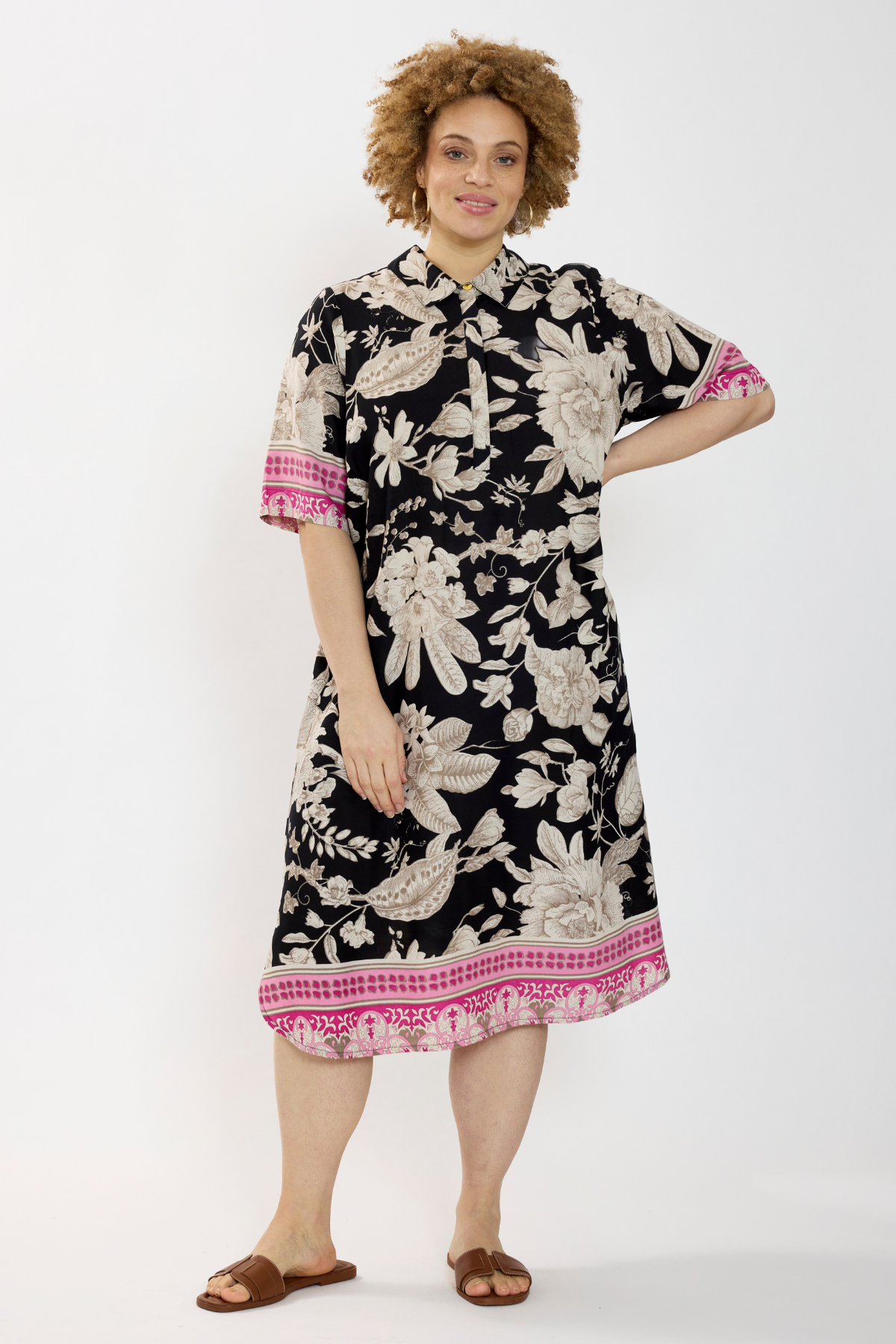 Denne smukke kjole fra Zhenzi er designet i en blød og let viskose kvalitet, der falder flot og føles behagelig mod huden. Det elegante blomsterprint kombineret med de fine pink detaljer giver kjolen et feminint og eksklusivt udtryk.