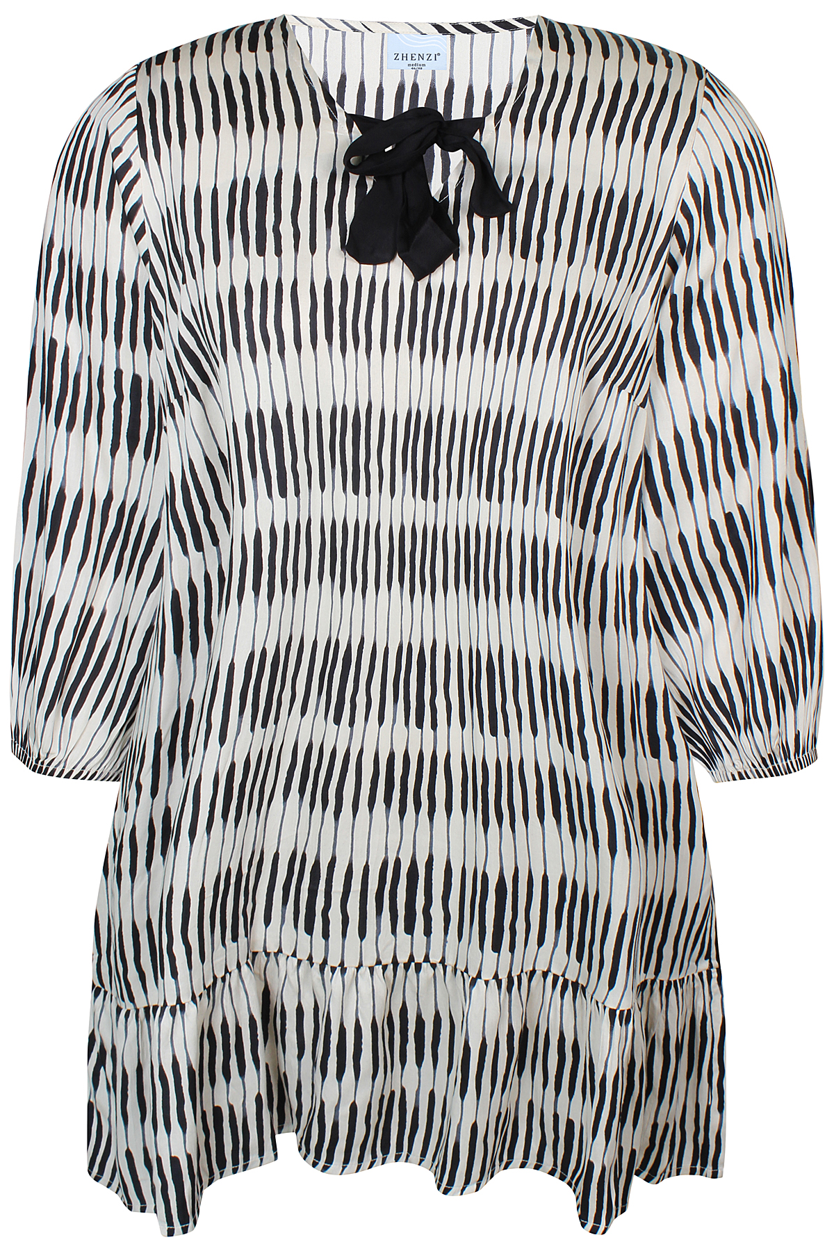 Skøn printet viscosesatin tunika fra Zhenzi, den er super elegant over et par stramme bukser, eller til et par leggings. Tunikaen er med 3/4 ærmer med elastikkant. Den er med v-hals med en fin sløjfe, som kan klippes af hvis man ikke ønsker den.